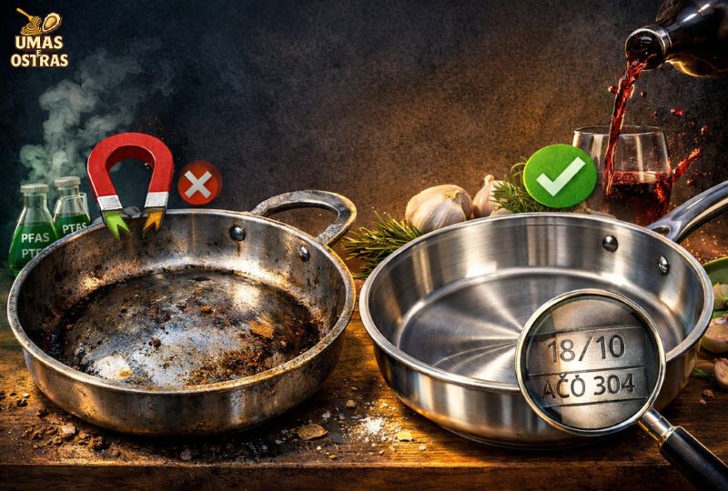 Para a biologia humana, ambos são seguros, mas o 316L é a muralha final. O Inox 304 (o famoso 18/10) defende 99% das necessidades de uma cozinha pesada. O Inox 316L, no entanto, recebe uma carga de 2% a 3% de Molibdênio. Na prática, o molibdênio torna a panela imune ao ataque feroz do sal e do cloro. Em cozinhas de navios mercantes, restaurantes na beira-mar ou na indústria farmacêutica, onde o ambiente salino devora os metais, o 316L é obrigatório. Para a sua casa, um excelente 304 já lhe concede soberania total, mas se encontrar o 316L, saiba que está a operar com o mesmo aço utilizado para forjar bisturis e implantes ósseos.
